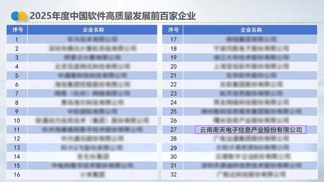 大会现场,中国软件行业协会发布了《中国软件产业高质量发展报告(2025)》,系统分析了当前我国软件产业发展现状、面临挑战与未来趋势;同时,发布了“2025 年度中国软件高质量发展前百家企业名单”。南天信息凭借突出的综合实力和强劲的创新能力,荣誉登榜第27位(较去年上升5位)。